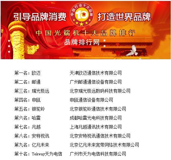 “2017年度中国光端机十大品牌评选”是由品牌排行网主办的全网范围最广、规模最大的品牌综合实力排名评选活动。此次评选,征集数万网友投票、点评,经过多轮审核精选出行业品质出众、人气最旺的十大品牌。品牌排行网致力于推动中国消费方式品牌化,构建良好的消费环境。活动创办以来反响热烈,不仅吸引了国内近一半的品牌和经销商的参与,同时也被新浪、网易、新华、中国、搜狐等70多家知名网媒高度关注,共享品牌盛宴。各大媒体的报道,为国内优秀品牌团聚人气,提高品牌知名度、影响力提供契机。荣登“2017年度中国光端机十大品牌”榜单的优秀企业和品牌如下: