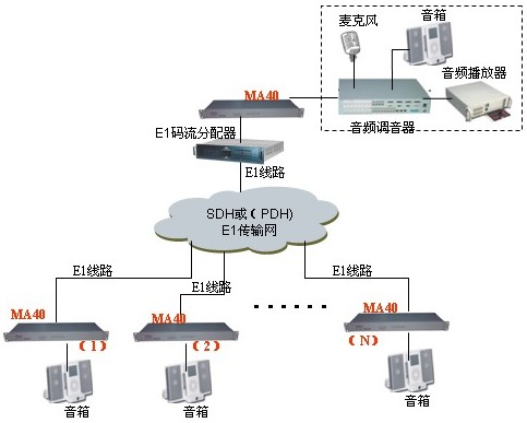 ◆ 配合E1接口分配器,可以实现一发多收的广播式传输音频信号源;